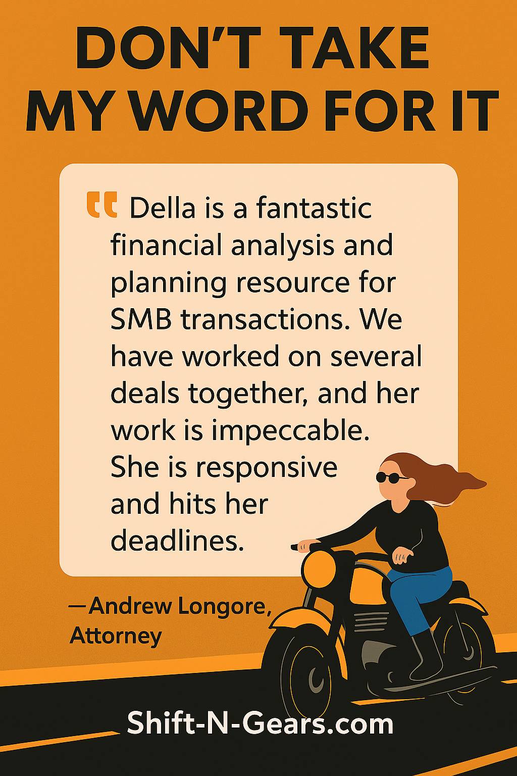 By Della Kirkman, CPA---From 4🌟 server at Cracker Barrel to financial freedom. Developing an SMB education/media co to help women create wealth through Acquisition Entrepreneurship https://www.shift-n-gears.com/newsletter